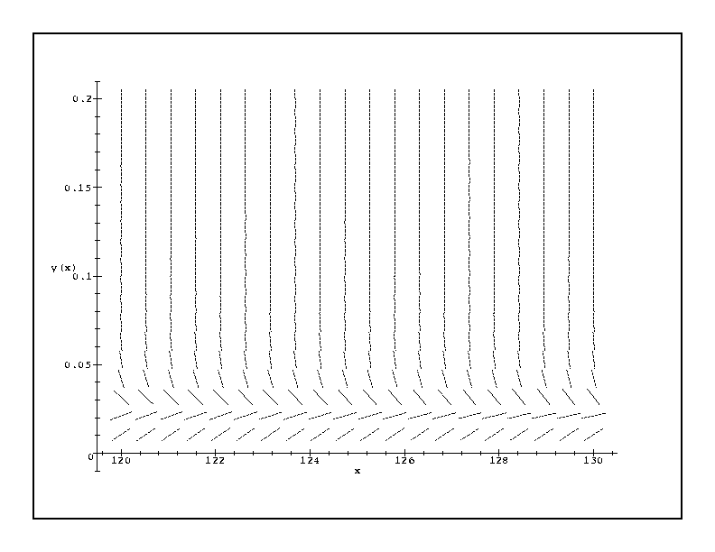 #14 in 2.4 > with(DEtools): > dfieldplot(diff(y(x),x)=y*(3-x*y),y(x),x=-5..5,y=-5..5,arrows=LINE);This is hard to look at. What does it realy mean? Notice that y' = 0 on the x-axis (y=0) and alone the hyperbola y=3/x. This may help you to understand the behavior as x gets large. If we start at a point on the negative y-axis it should be clear that y goes to -infinity as x goes to infinity. If we start at y(0)=0 then the limit is 0 since y(x)=0 is a solution. (Is this solution unique? It is hard to tell from the plot alone.) Now for y(0) positive it is less clear what happens as x goes to infinity. The curves start out going up but then turn sharply down. Do they go to 0 in the limit or to some small number? Let's "zoom in". > dfieldplot(diff(y(x),x)=y*(3-x*y),y(x),x=120..130,y=0..0.2,arrows=LINE);